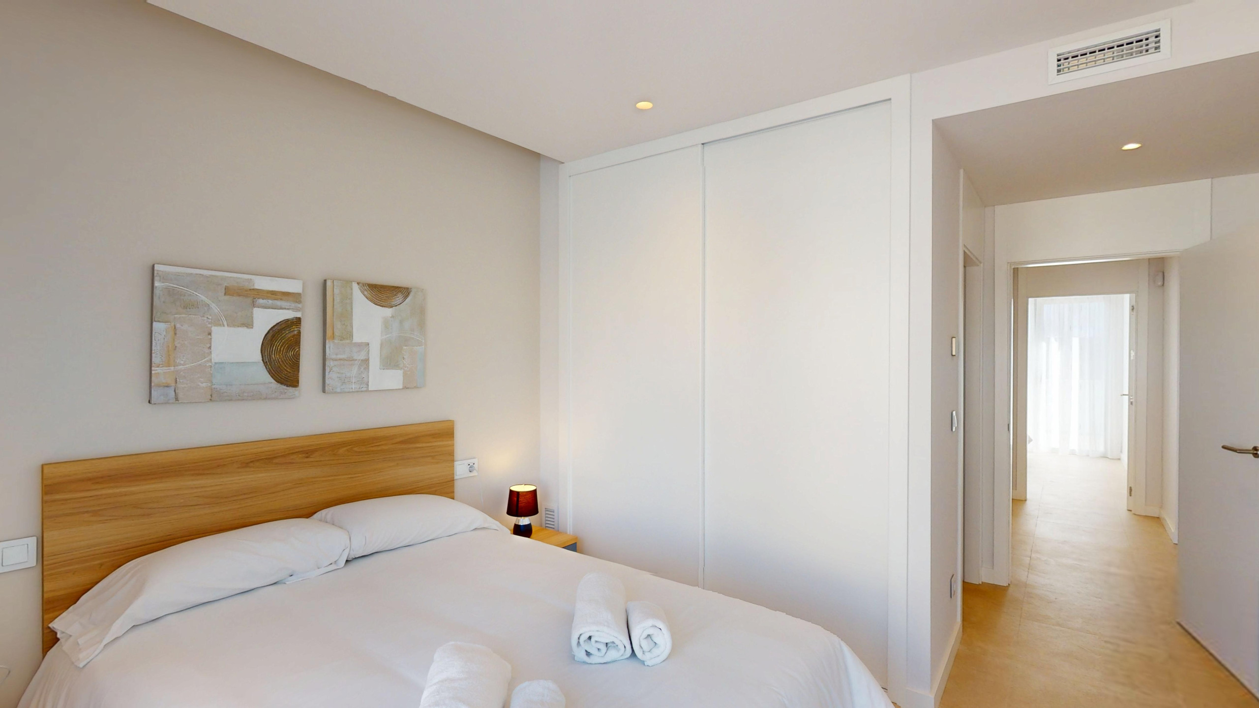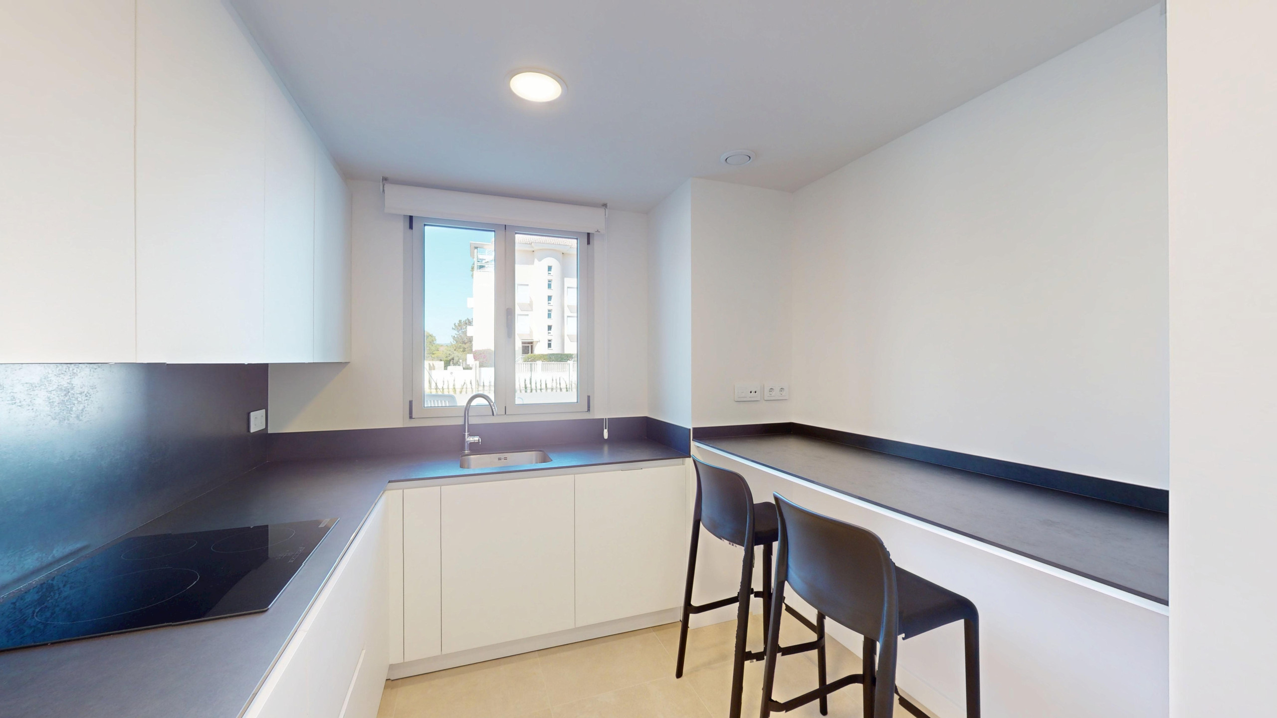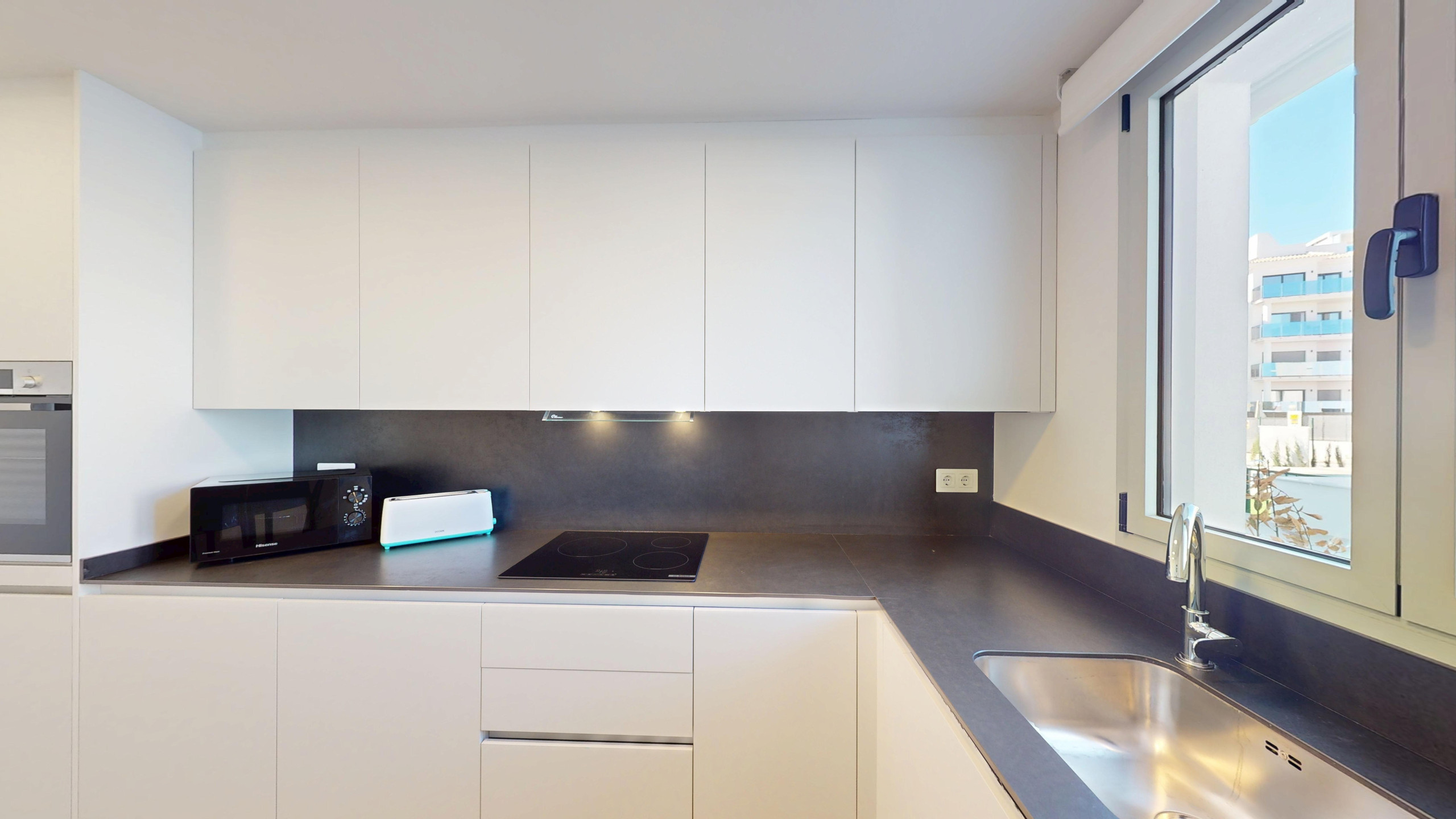 Die Wohnung verfügt über drei Schlafzimmer, zwei davon mit Doppelbett und zwei mit Einzelbetten. Es gibt zwei Badezimmer mit Dusche, die Komfort und Privatsphäre für alle Gäste gewährleisten. Die offene Küche ist vollständig ausgestattet mit modernsten Haushaltsgeräten, einschließlich Waschmaschine, Geschirrspüler, Backofen, Mikrowelle, Kaffeemaschine und einer großen Auswahl an Küchenutensilien.