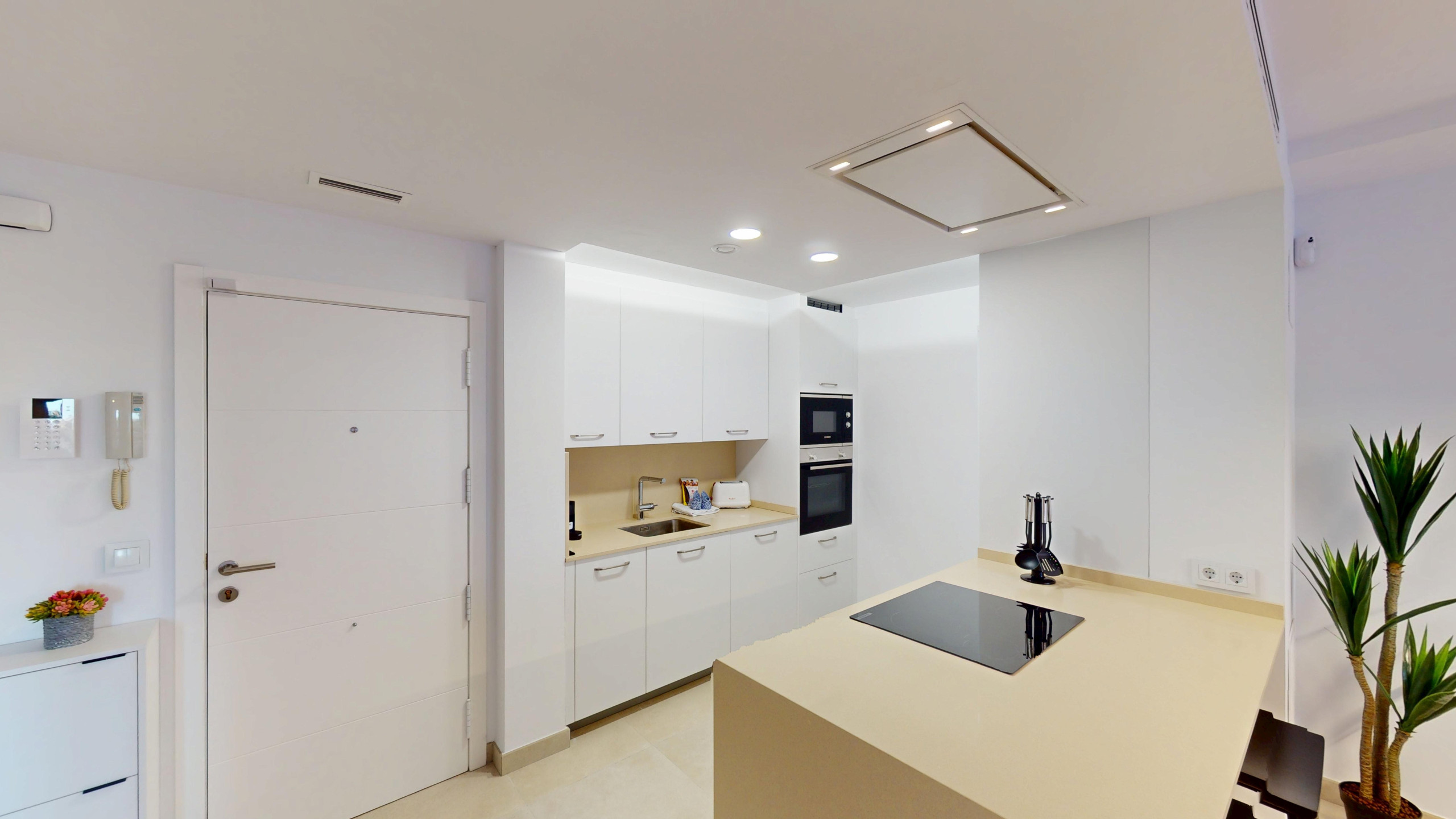 Der Innenbereich ist vollständig mit Klimaanlage und Wärmepumpe ausgestattet, um das ganze Jahr über eine perfekte Temperatur zu gewährleisten. Die offene Küche ist komplett mit modernen Haushaltsgeräten wie Waschmaschine, Geschirrspüler, Backofen, Mikrowelle, Kaffeemaschine, Toaster und einer großen Auswahl an Kochgeschirr und Küchenutensilien ausgestattet.