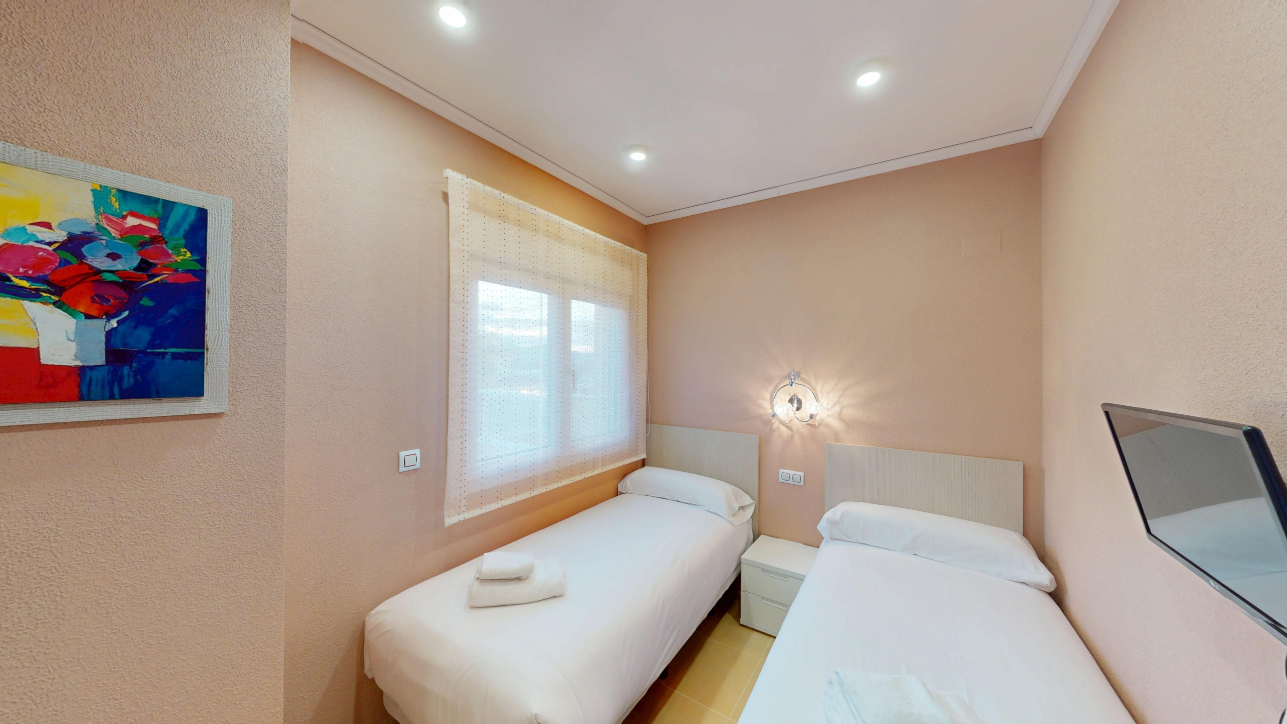 Im Inneren zeichnet sich die Wohnung durch ihre funktionale Aufteilung mit zwei Schlafzimmern aus, die bis zu 4 Personen bequem beherbergen können. Sie verfügt über ein Hauptschlafzimmer mit einem Doppelbett und zwei Einzelbetten im zweiten Schlafzimmer, was einen optimalen Schlaf für alle Gäste gewährleistet.