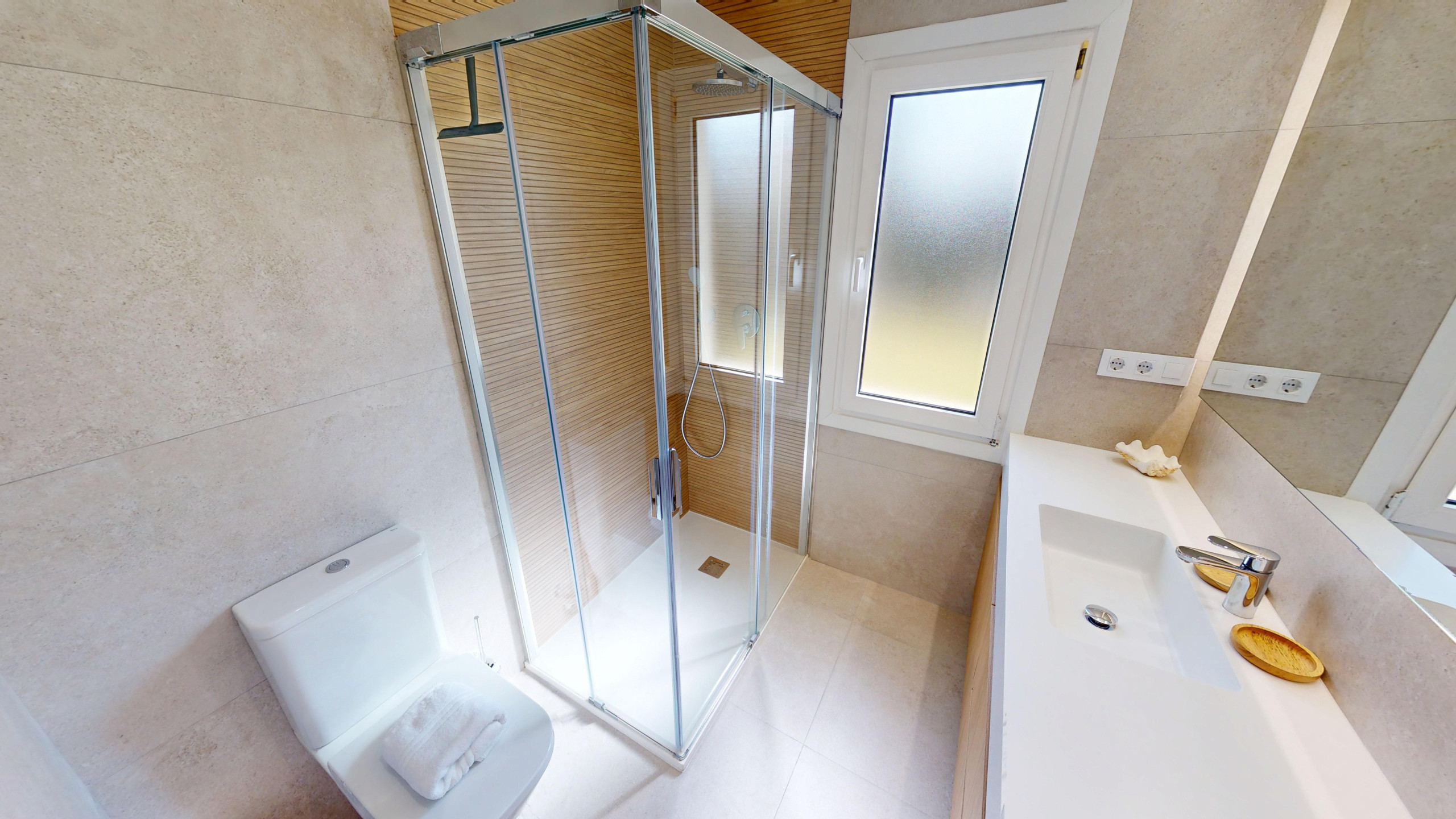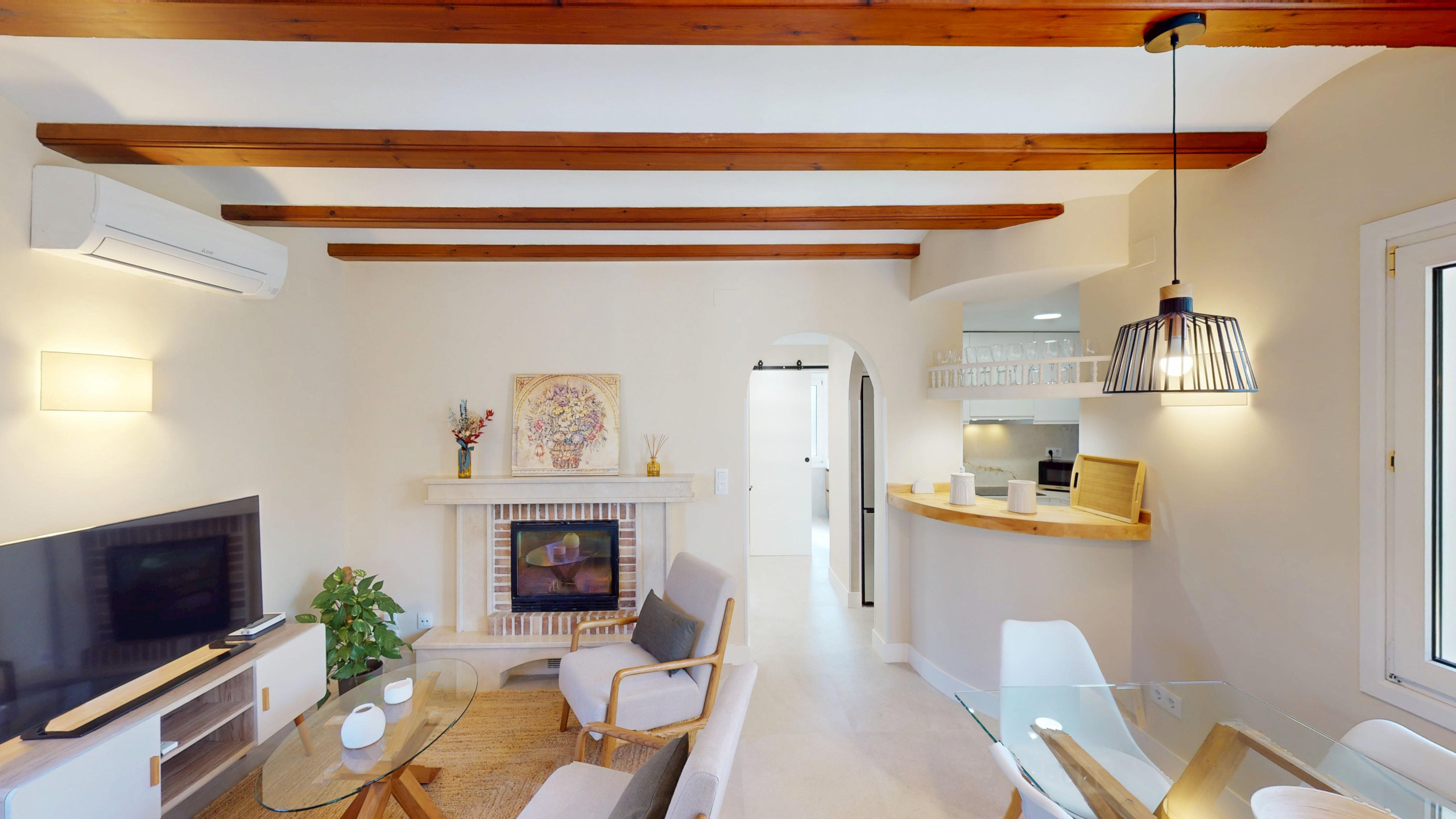 Zu den Hauptmerkmalen gehören Klimatisierung mit Wärmepumpe, Klimaanlage im Wohnzimmer und in einigen Zimmern, WLAN-Verbindung, Fernsehen, Kamin und Bügeleisen. Die Unterkunft bietet auch einen privaten Parkplatz, was die Mobilität während des Urlaubs erleichtert.