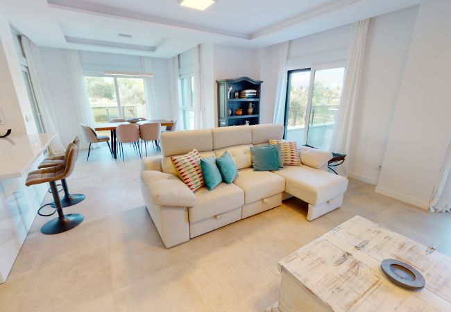 Nice view of the golf course, modern and clean interiors in a recently constructed building. Lovely large terraces.It was our third time that we stay in this apartment for a period of six weeks each time .