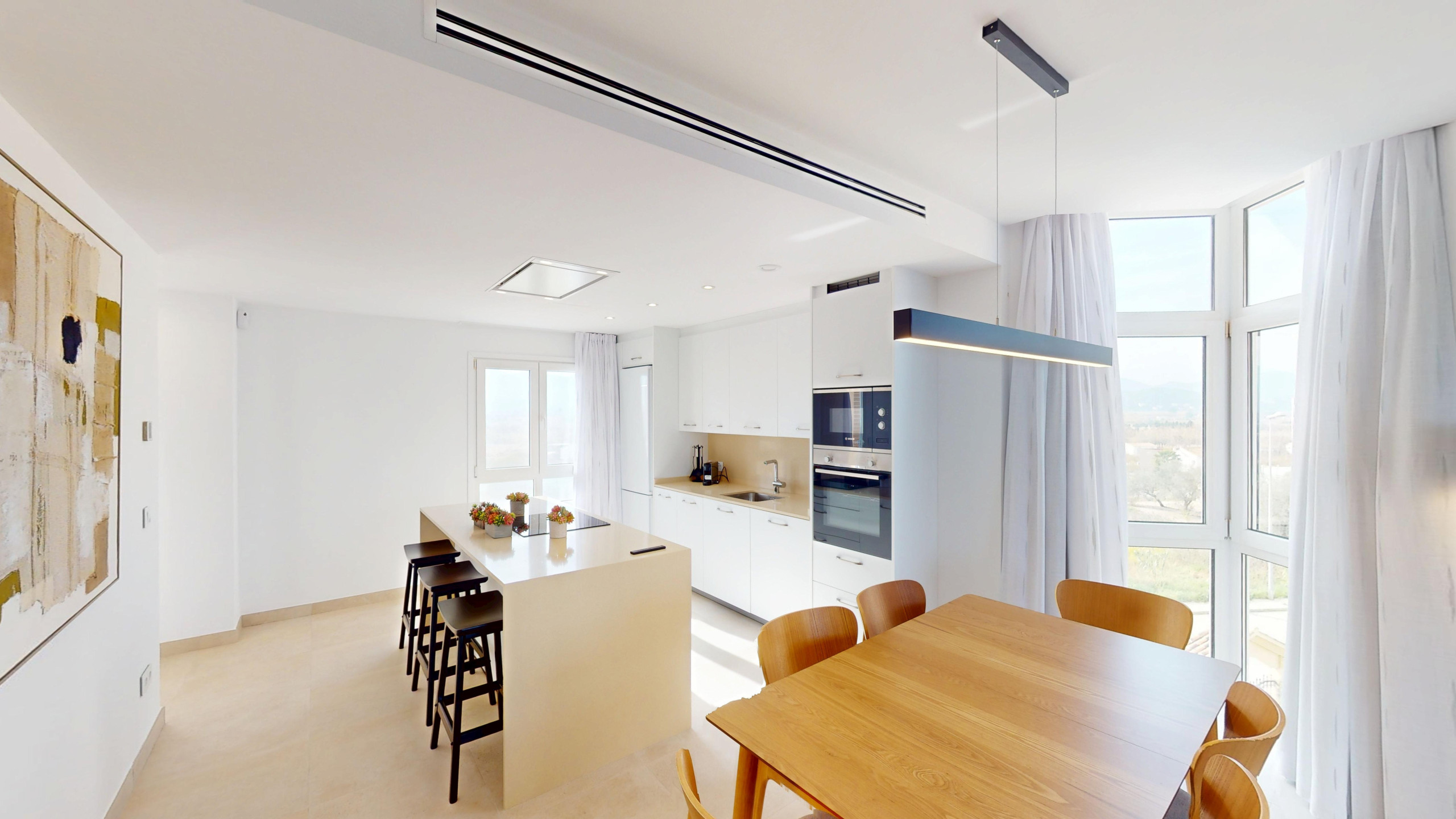 La cuisine américaine entièrement équipée est un point fort, avec des appareils électroménagers modernes tels que lave-linge, lave-vaisselle, four, micro-ondes, cafetière, grille-pain, et un équipement complet de vaisselle. De plus, elle dispose de la climatisation et d'une pompe à chaleur pour maintenir une température parfaite à toute époque de l'année.